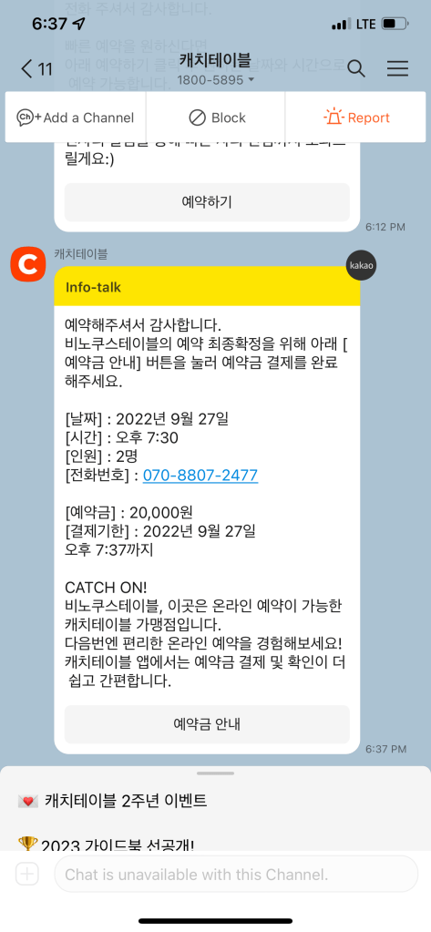 CT를 통해 전화를 해봤다면 알겠지만, 식당이 전화를 받지 못했거나, 고객이 연결되기 이전에 통화를 끊었을 경우, 자동으로 CT 예약 알림톡이 간다는 걸 알 수 있다. (예약을 하고자 할 때도 식당에서 시간을 직접 지정해서 예약금 결제 알림을 보낼 수 있다!) 자동으로 알림톡이 간다는 사실은 전화라는 창구를 통해 들어 오고 나가는 플로우를 캐치테이블이 정확하게 트랙하고 있다는 것이고, 더 나아가 유저에게 최적의 방법으로 응답할 방법을 알고 있다는 것이다 (물론 한국은 전국민이 카톡을 쓰므로 이 부분은 깊게 고민하지 않아도 된다. 그럼에도 불구하고 문자라는 최소한의 방어로직이 존재하긴 한다). 어떻게 보면 너무나도 당연하고 자연스러운 연동을 캐치테이블은 실제로 물 흐르듯이 해내고 있다.