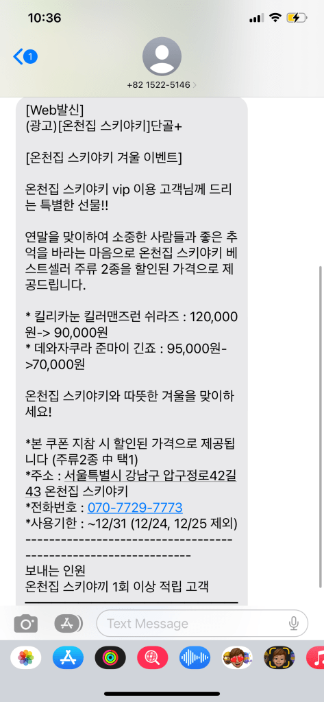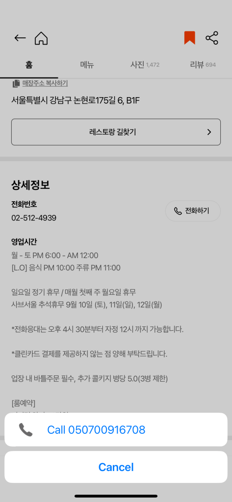 위 그림에서 전화하기를 누르면, 아래와 같이 식당의 번호가 아닌 다른 안심번호(050)로 연결된다. 1차적으로 CT의 정겨운 녹화 연결음이 나오고, 그 이후에 식당과 연결된다. 앱을 둘러 보니, 이 안심번호는 식당마다 고유하게 부여되어 지속되는 번호로 보인다. 앱 내 “전화하기”는 모두 이 안심번호를 1차적으로 거치는데 그럼 이 번호는 단순 녹화 메세지를 들려주기 위함일까? 결론부터 얘기하면 이 연결음에 비밀이 있다.