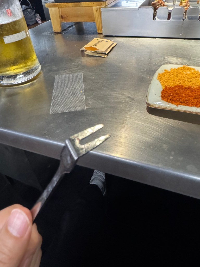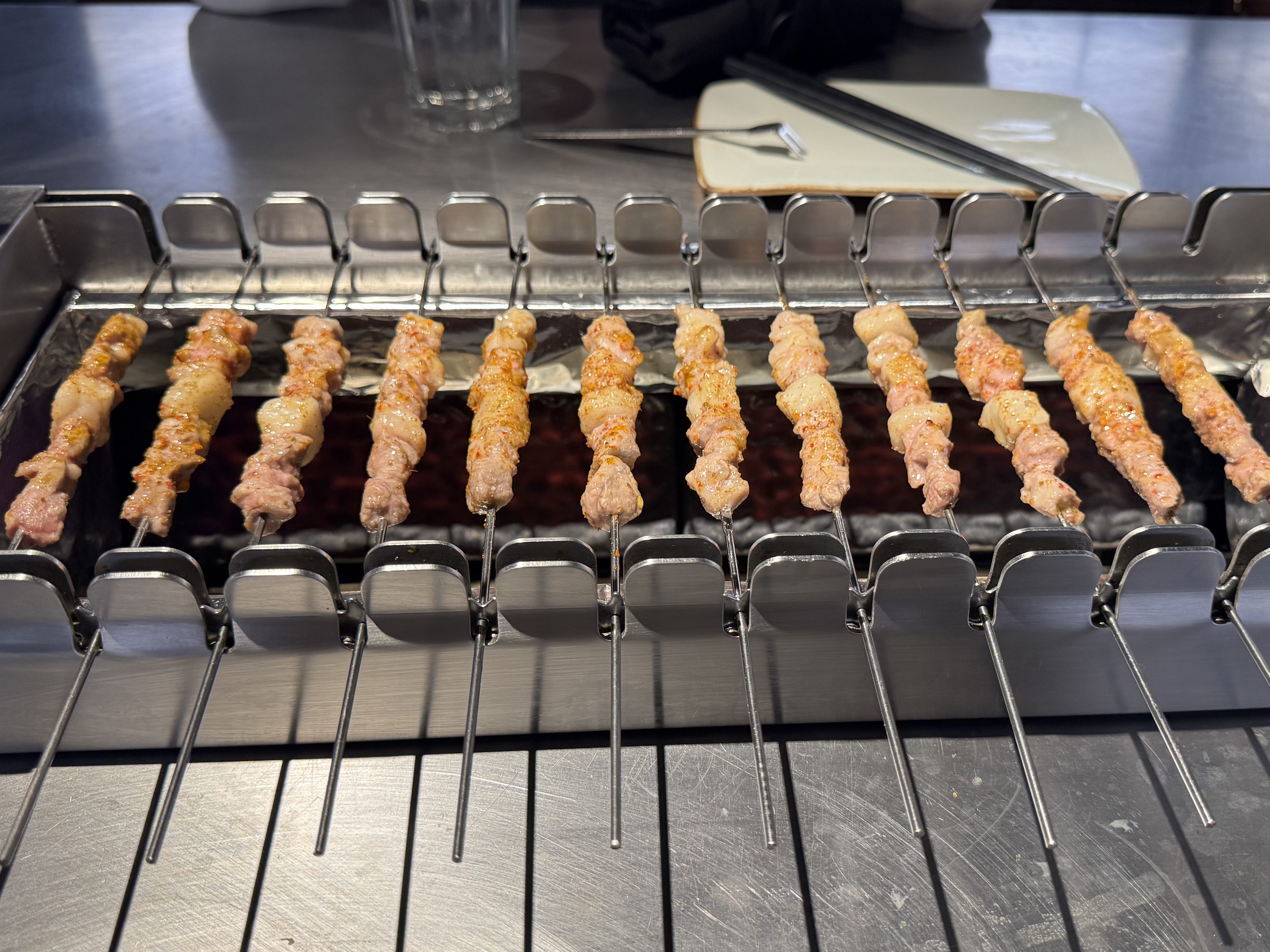 Meat arrives and your server scratches off your paper bill and types intensely on their phone. You like the redundancy. He skillfully lays the skewers down on the tray and presses the skewers that creates a crisp click. You like the efficiency and rhythm that it creates. But you just realize all the skewer handles are facing you and you think about whether to flip half of them to the other side for your partner. You decide to wait and give the benefit of doubt to the experts.